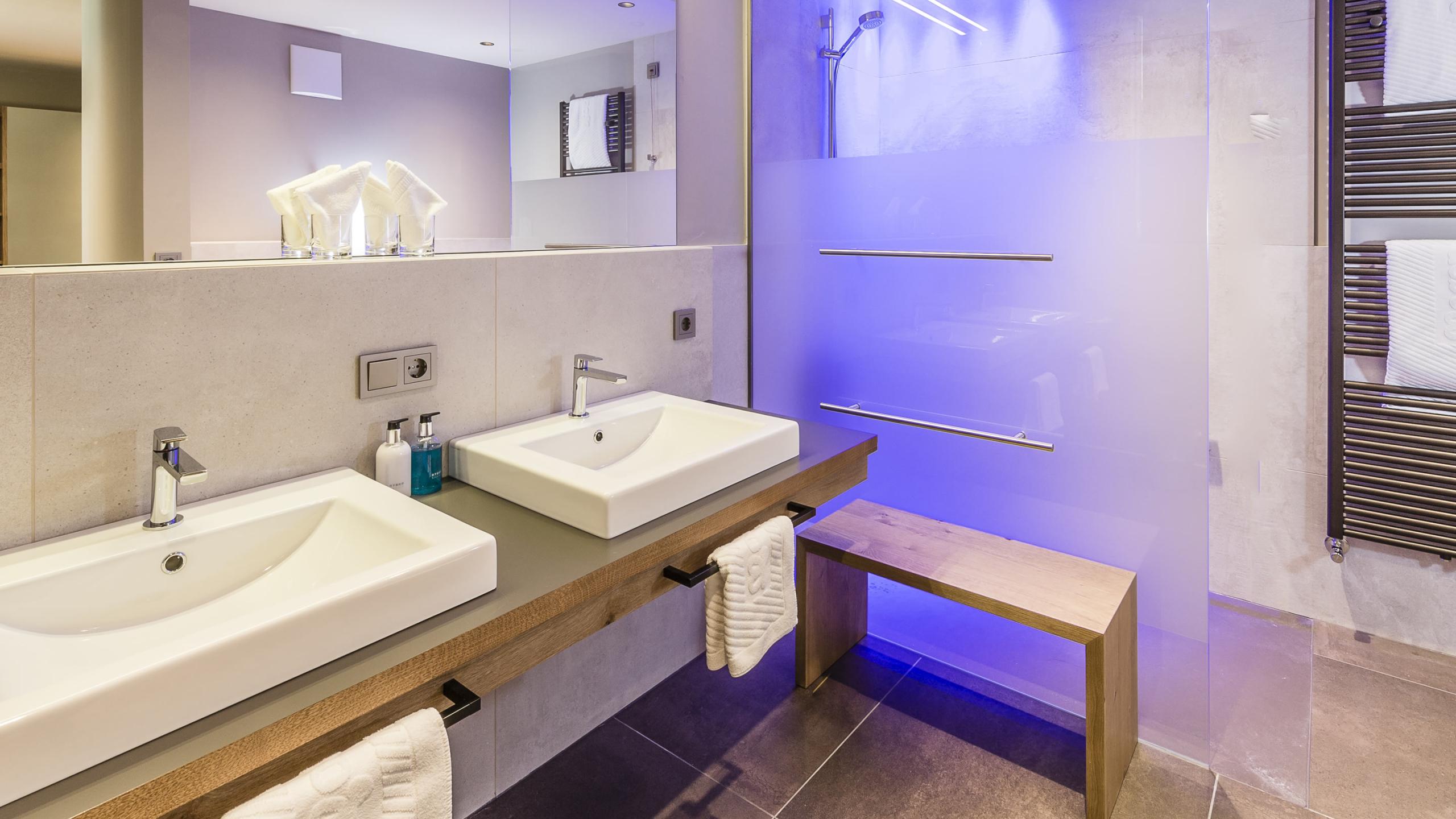 Suite elegante e priva di barriere architettoniche con aria condizionata, pavimento di legno rovere, letto king-size, ampio soggiorno con lettino relax 1,60m x 2,00m per due persone. Divano ad angolo e fontana con acqua potabile. Bagno moderno con lavabo doppio, tavolino e specchio da trucco, doccia, WC e bidet, connessione WiFi. La suite si trova nel piano rialzato sopra l’area saune Arbor Vitae ed è dotata di una terrazza con tetto e un ampio giardino privato con vasca da bagno di design, luce d’effetto e vista sulle montagne della Mendola e sul versante sud-est. I cani non sono ammessi in questa suite.