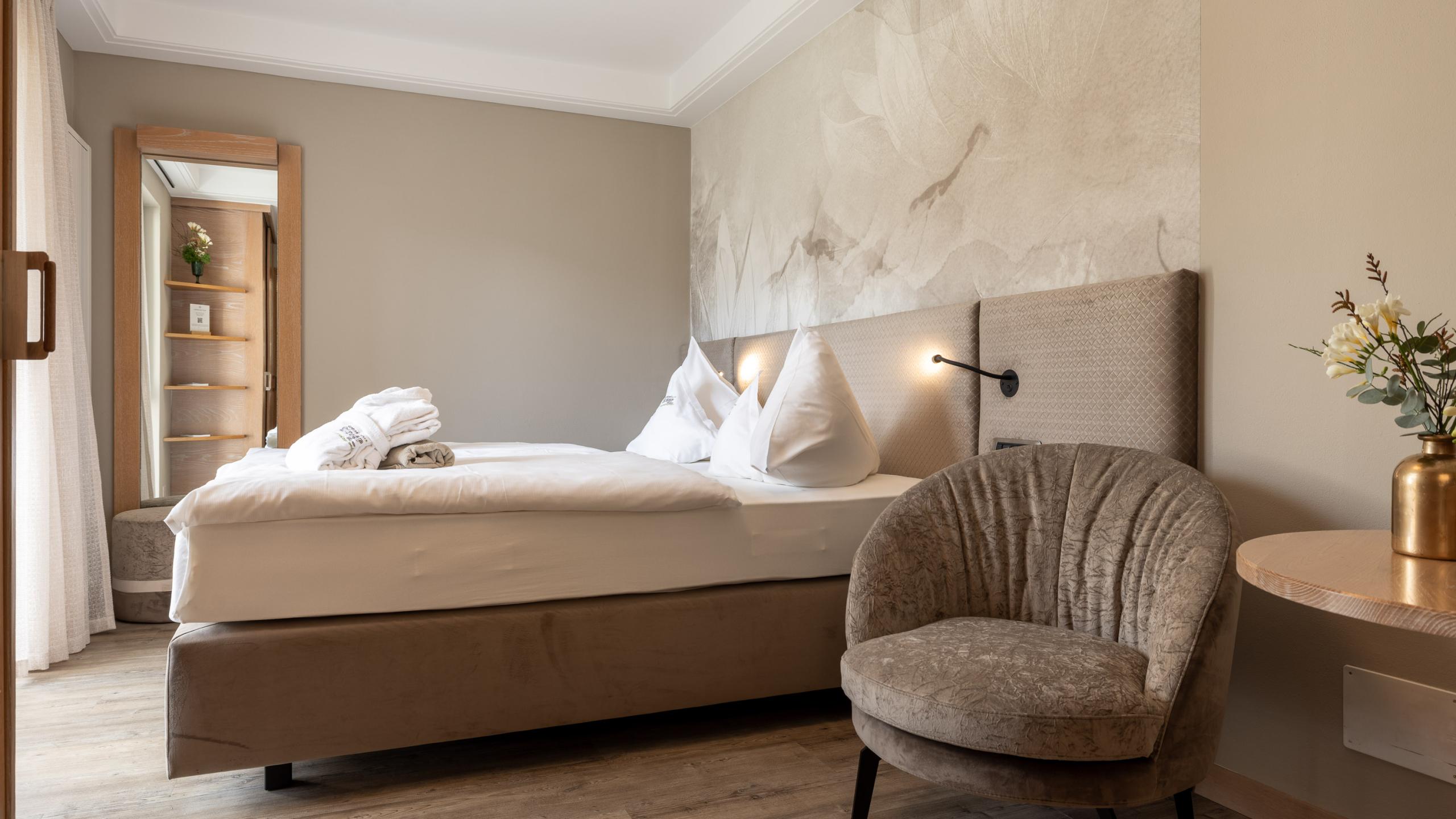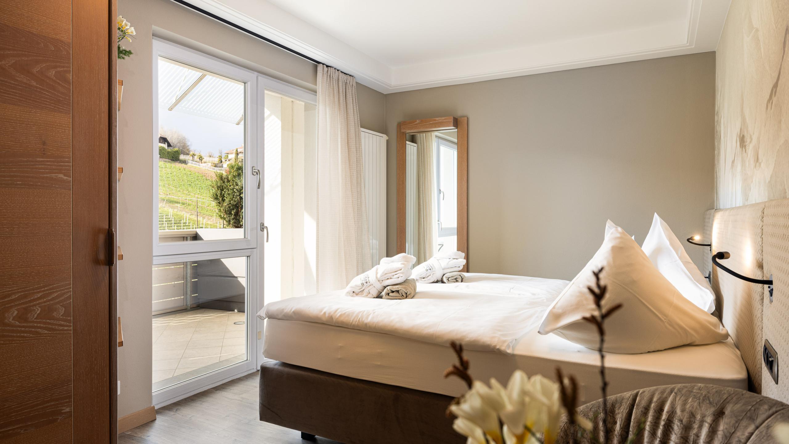 Camera doppia in legno di castagno locale, letto king - size, pavimento di legno, minibar, TV satellitare, telefono, radiosveglia, cassaforte, connessione WiFi, aria condizionata, bagno molto spazioso con doccia XL e vasca da bagno freestanding con vista panoramica, WC e bidet separati, piano in granito con asciugacapelli e specchio da trucco. Balcone al sole con vista sulle vigne e sulle montagne della Mendola.